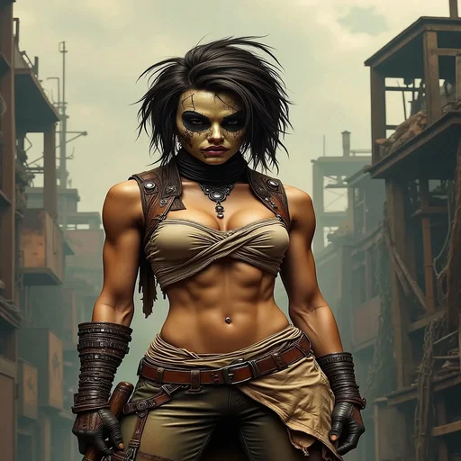 Uma mulher musculosa com pintura de caveira no rosto e cabelos pretos desgrenhados, vestindo uma roupa de couro e uma bandana, em um cenário pós-apocalíptico.