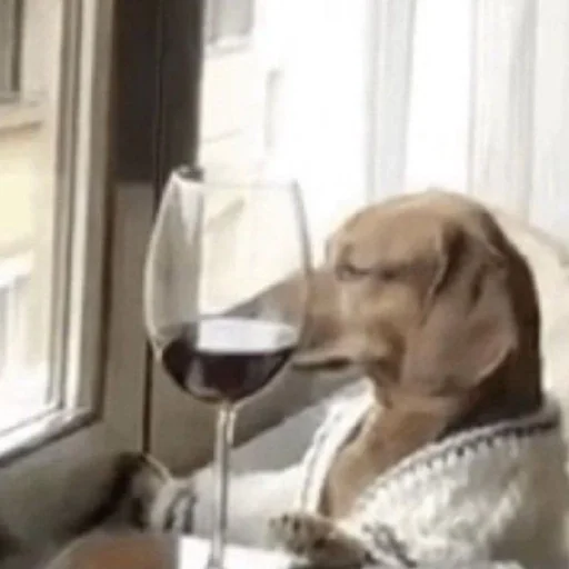Um cachorro sentado em um sofá, olhando pela janela enquanto segura uma taça de vinho tinto.