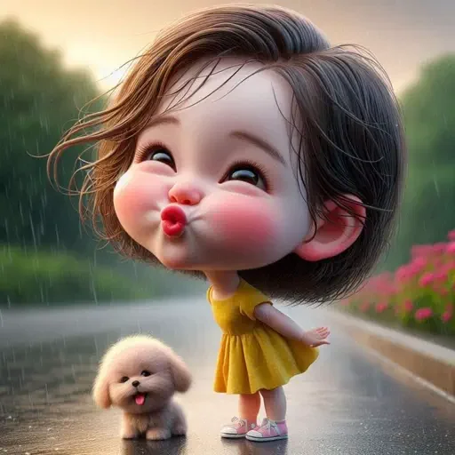 Menina de cabelo castanho e vestido amarelo fazendo careta engraçada com um cachorrinho ao lado em uma estrada.