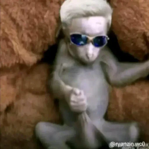 Um monstro cinza com óculos de sol sentado em uma caverna ou buraco, com uma expressão séria e a mão levantada.