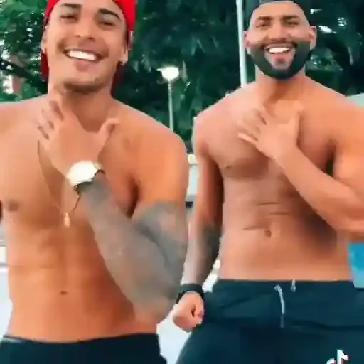Dois homens sem camisa, sorrindo e fazendo um gesto com as mãos, ao ar livre com árvores ao fundo.