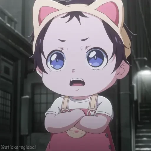 Menina de olhos azuis e orelhas de gato, com expressão de surpresa ou medo, vestindo uma camiseta branca e um macacão rosa.
