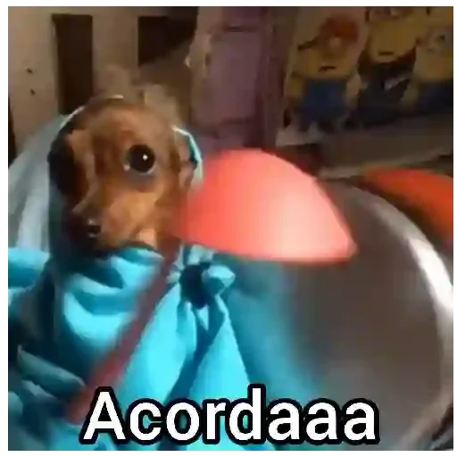 Um cachorro castanho com expressão surpresa, vestido com uma roupa azul, com o texto 'Acordaaa' embaixo.