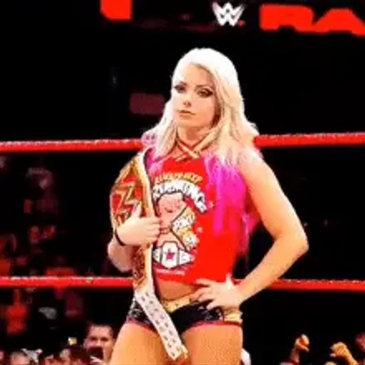 Uma mulher loira com cabelo rosa, vestindo um top vermelho com uma faixa dourada e calcinha preta, em um ringue de luta livre com cordas vermelhas.
