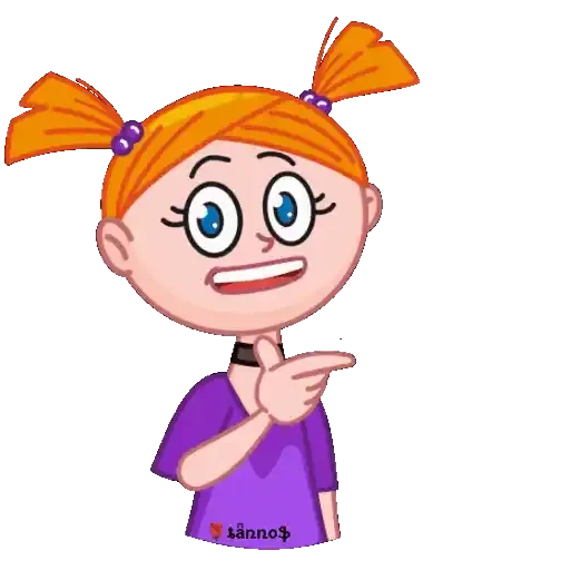 Menina de olhos azuis e cabelos laranjas em dois coques, vestindo uma blusa roxa, aponta para o lado com um sorriso.