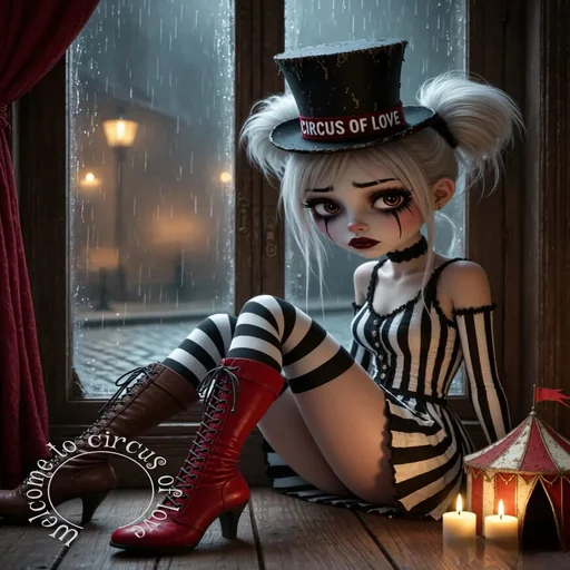 Uma mulher com penteados duplos e maquiagem pesada, vestindo um chapéu preto com 'Pieces of Love', um bodysuite listrado preto e branco, meias arrastão vermelhas e botas de cano alto vermelhas, sentada ao lado de velas acesas em uma janela com cortina vermelha.