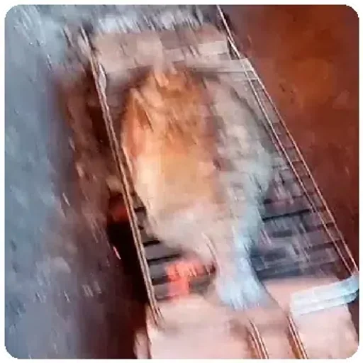 Gato laranja em uma escada, com expressão confusa ou assustada, em um ambiente com cores quentes e desfocado.