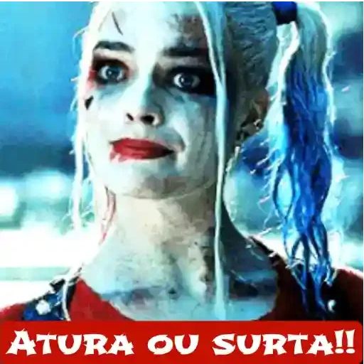 A personagem Harley Quinn, com maquiagem branca e vermelha, cabelo loiro com uma trança azul, e um olhar sério. Abaixo dela, uma faixa vermelha com o texto 'ATURA OU SURTA!!'