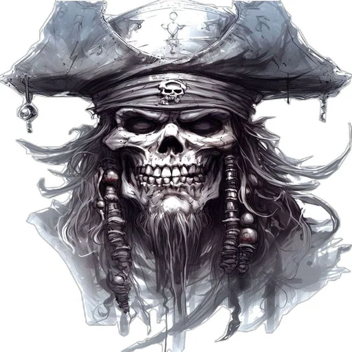 Crânio de pirata com chapéu e bandana, detalhes em tons de cinza.