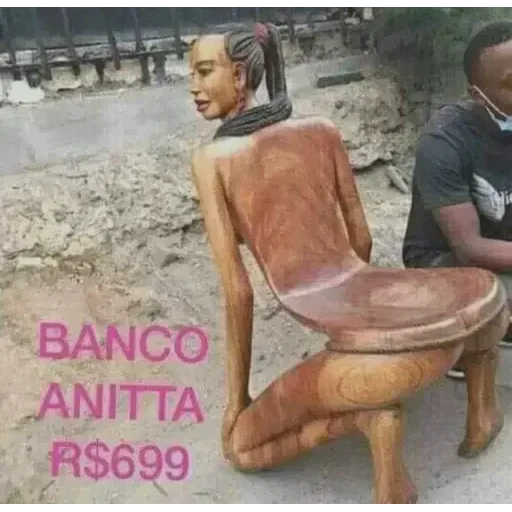 Uma estátua de uma mulher nua sentada em um banco, com um homem ao lado. O texto 'BANCO ANITTA R$699' está escrito em rosa.