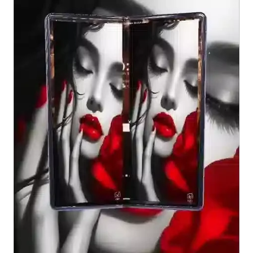 Uma imagem de uma mulher com lábios vermelhos e maquiagem pesada, com as mãos cobrindo partes do rosto. A imagem está em preto e branco, com destaques de vermelho nos lábios e unhas.