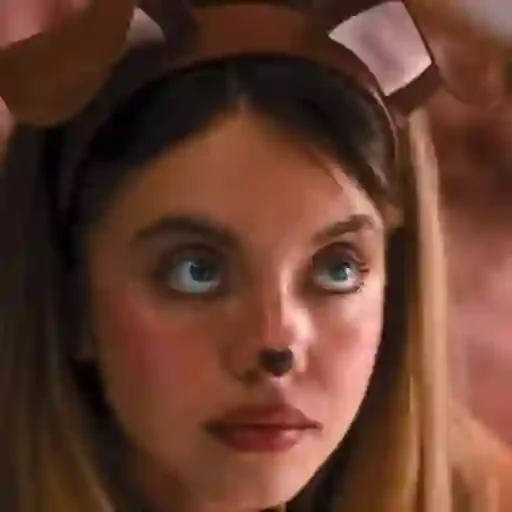 Uma mulher com expressão surpresa, usando uma faixa com orelhas de veado na cabeça. Ela tem cabelos castanhos longos e olhos claros.