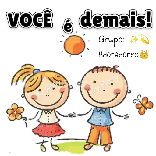 Dois personagens de desenho animado, um menino e uma menina, sorrindo e segurando as mãos. A menina tem o cabelo loiro em um rabo de cavalo e veste uma saia rosa. O menino tem o cabelo castanho e veste uma camisa azul. Há um sol e uma borboleta ao fundo. O texto 'VOCÊ é demais!' está escrito em preto.