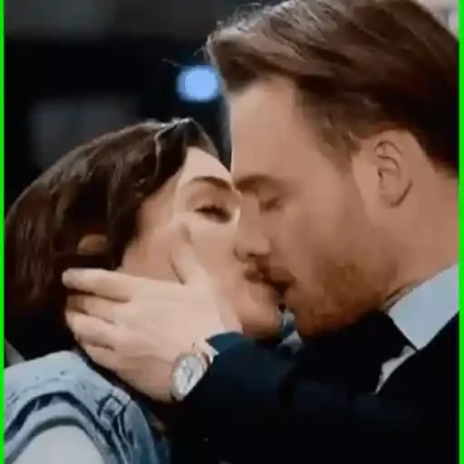 Um homem beijando uma mulher no rosto, com a mão no rosto dela. Ele está de terno e ela de uma blusa azul.