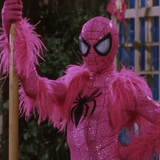 Homem-Aranha vestido com um traje rosa com pelos e segura um taco de beisebol.