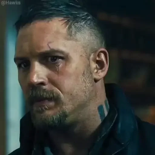 Rosto de homem com ferimentos e olhando para o lado, com um fundo escuro.