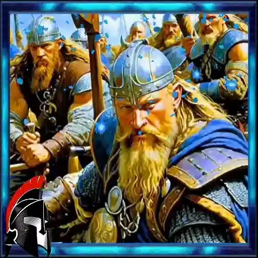 Um guerreiro viking com barba longa e armadura azul e dourada aparece em primeiro plano, com outros guerreiros ao fundo. Ele usa um capacete prateado com detalhes em ouro.