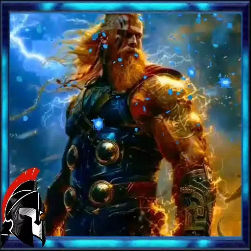 Imagem de Thor, o deus nórdico do trovão, com cabelo loiro e barba, vestindo uma armadura dourada e azul, com raios ao fundo.