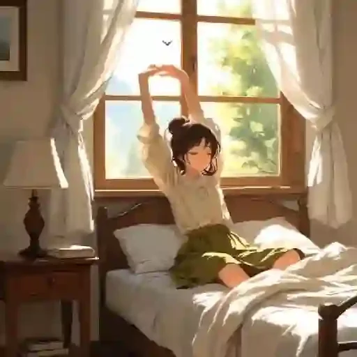 Uma jovem com cabelo preto e um coque sentada na cama, esticando os braços acima da cabeça em frente a uma janela com cortinas brancas e uma vista para árvores verdes ao ar livre.