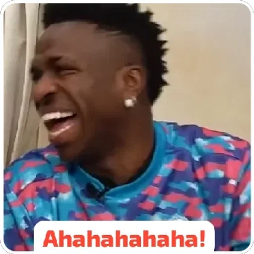 Um homem negro com cabelo curto e um sorriso largo, usando uma camisa azul com manchas rosa e roxas. Ele está rindo e o texto 'Ahahahahaha!' aparece abaixo dele.