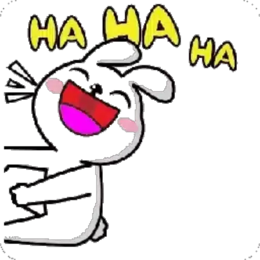 Um coelho branco com olhos fechados e boca aberta, com as palavras 'HA HA HA' em amarelo acima dele.