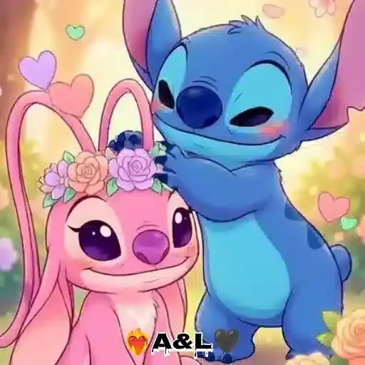 Stitch e Angel, personagens de Lilo & Stitch, aparecem juntos com corações ao redor. Stitch é azul, tem orelhas grandes e um focinho preto. Angel é rosa, com uma flor na cabeça e olhos roxos.