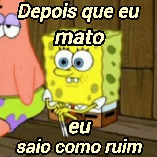 SpongeBob com uma faca e um olhar sinistro, ao lado de Patrick, com o texto "Depois que eu mato eu saio como ruim" sobreposto.
