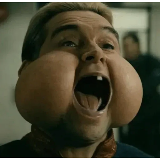 Homem com bochechas grandes e boca aberta, parecendo surpreso ou com dor.