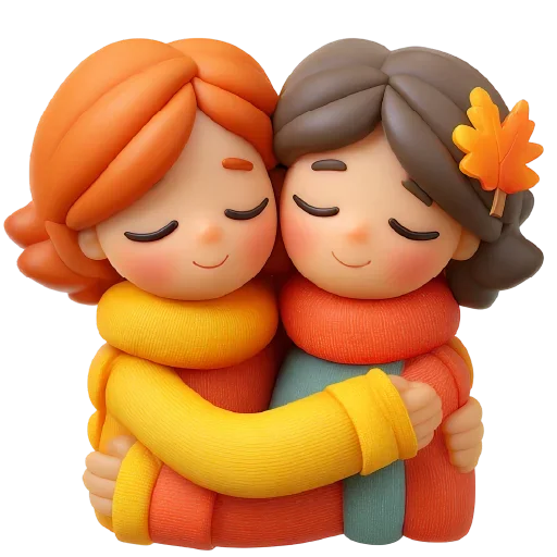 Duas mulheres se abraçando, uma com cabelo laranja e outra com cabelo castanho, ambas com expressão de felicidade e paz.