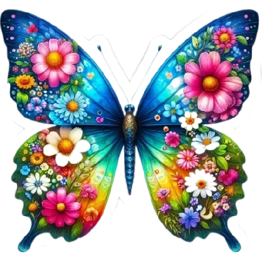 Uma borboleta colorida com asas decoradas com flores de várias cores, incluindo rosa, branco, amarelo e azul, em um fundo branco.