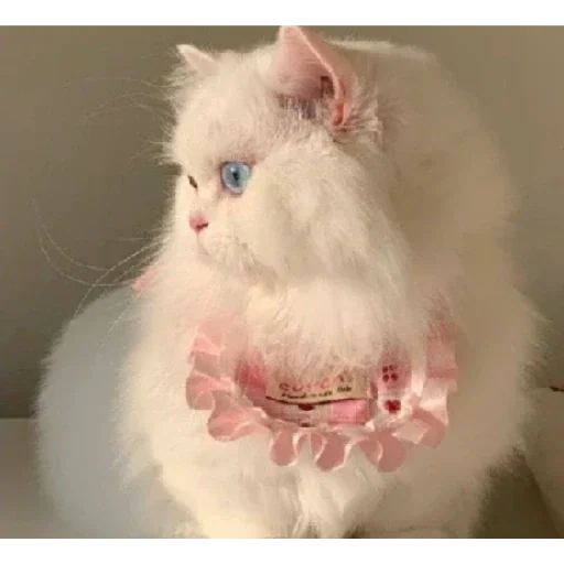 Gato branco com olhos azuis e uma coleira rosa. O gato parece ter um olhar sério e está posicionado contra uma parede cinza.