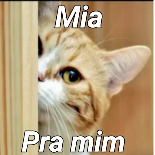 Um gato laranja com olhos amarelos espiando de trás de uma porta, com o texto 'Mia Pra mim' sobreposto.