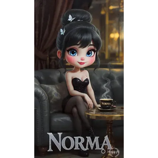 Uma mulher de olhos azuis e cabelos pretos sentada em um sofá com uma xícara de café fumegante na mão, vestindo um vestido preto. A imagem traz o nome 'NORMA' na parte inferior.