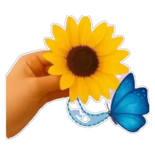 Uma mão segurando um girassol em um vaso de vidro transparente com um borboleta azul ao lado.