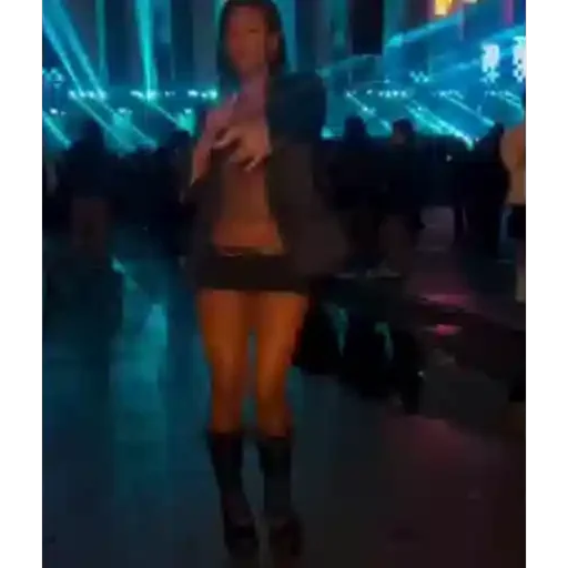 Mulher dançando em um ambiente noturno com luzes azuis. Ela está vestida com uma saia curta e botas.