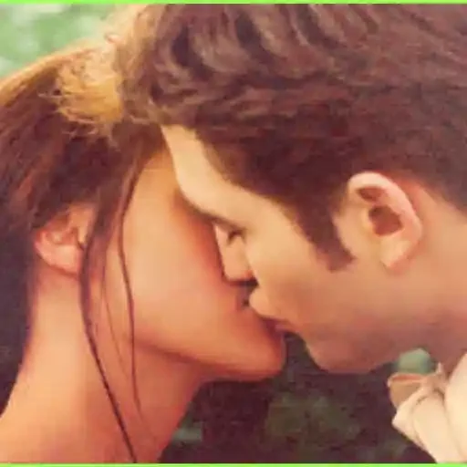 Um casal se beijando, com a mulher à esquerda e o homem à direita, ambos com expressões suaves e românticas.