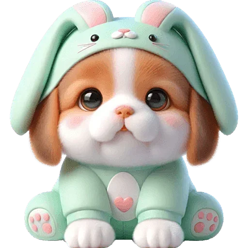 Um cachorrinho fofinho vestido com um pijama de coelho verde claro, com orelhas de coelho na cabeça e patas com unhas rosadas.