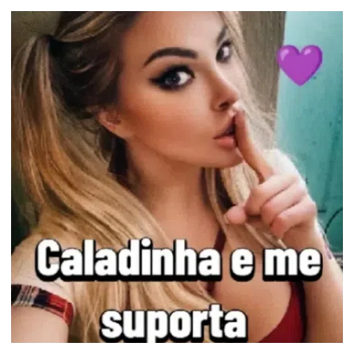 Uma mulher loira fazendo um gesto de silêncio com o dedo na boca, com um coração roxo ao lado e o texto 'Caladinha e me suporta'.