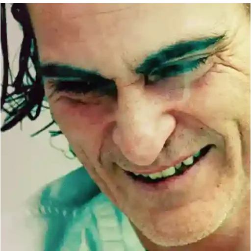 Rosto de um homem com um sorriso malicioso, sobrancelhas pintadas de azul e um olhar lateral. Ele parece estar com um sorriso envergonhado ou uma careta engraçada.