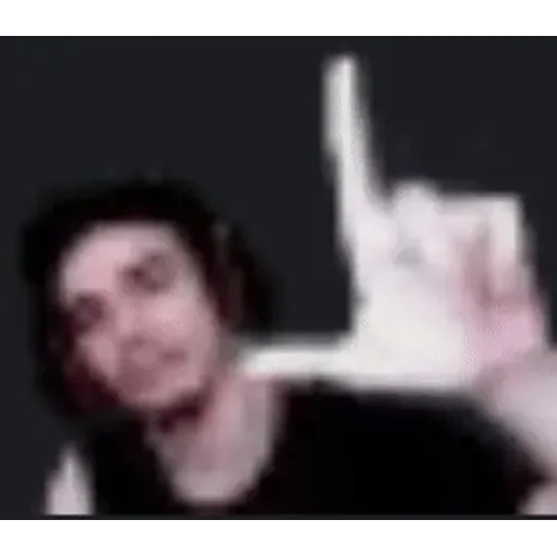 Um homem com cabelo preto e camiseta preta faz um gesto com a mão direita, parecendo um 'rock' ou 'shaka', contra um fundo escuro.