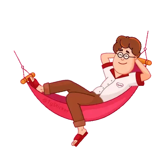 Um homem de óculos e cabelos castanhos relaxado em uma rede rosa, usando uma camisa branca com detalhes em vermelho e calças castanhas.