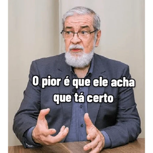Um homem mais velho com cabelos grisalhos e barba, usando óculos e um blazer, sentado à mesa com as mãos abertas em gesto de conversa. Sobreposto à imagem, o texto "O pior é que ele acha que tá certo".