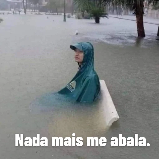 Homem sentado em uma cadeira em meio a uma inundação, usando um capuz verde. A legenda 'Nada mais me abala' aparece abaixo.