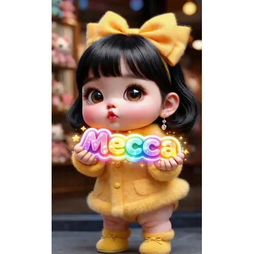 Menina de cabelo preto com franja e um laço amarelo na cabeça, vestindo um casaco e sapatos amarelos, segura uma placa colorida com o texto 'Mecca'.