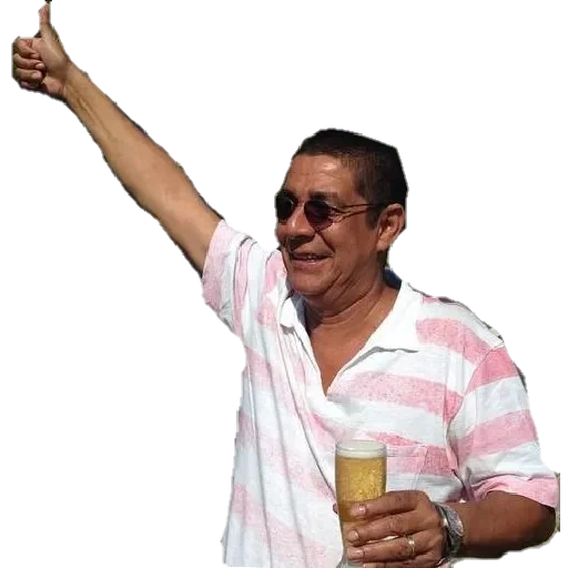 Homem de camisa listrada rosa e branca dando um polegar para cima enquanto segura um copo.