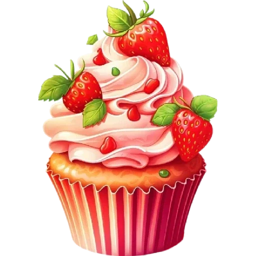 Um cupcake com cobertura rosa e morangos frescos em cima, decorado com folhas verdes.
