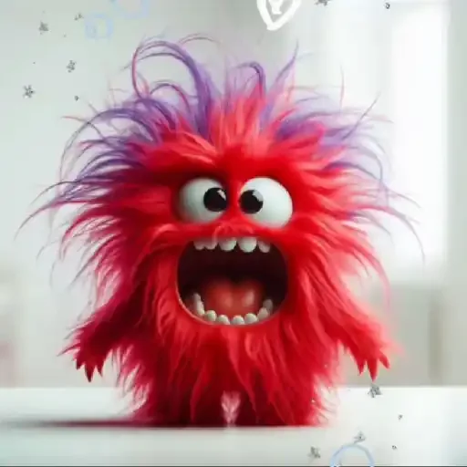 Um monstro vermelho peludo com olhos grandes e boca aberta, expressando surpresa ou susto. Ele tem pelos roxos na cabeça e está em um fundo branco com estrelas.