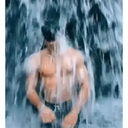 Homem musculoso sem camisa embaixo de uma cachoeira