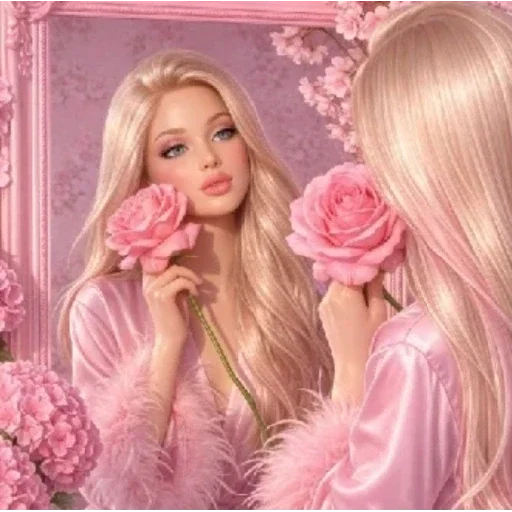 Uma mulher loira com uma expressão serena segura uma rosa rosa perto do rosto enquanto se olha no espelho. Ela veste uma roupa rosa com detalhes de penas e há flores rosas ao redor.