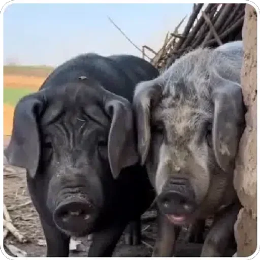 Dois porcos, um preto e um cinza, estão lado a lado, olhando para a frente com expressões fofas.